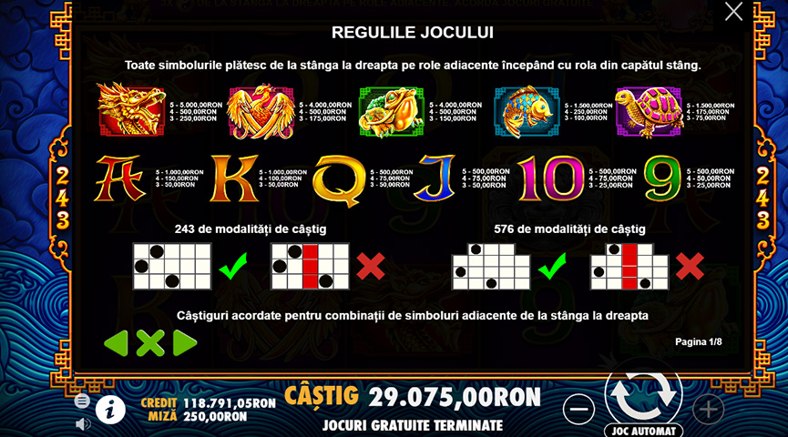 Pe ecran vei vedea 5 simboluri care provin din mitologia asiatică. Acestea aduc profituri mari. Trebuie să ai cel puțin 3 simboluri care se potrivesc de la stânga la dreapta pe rolele adiacente pentru a obține o combinație câștigătoare. Simbolurile suplimentare sunt cărțile de joc care aduc câștiguri mai mici.