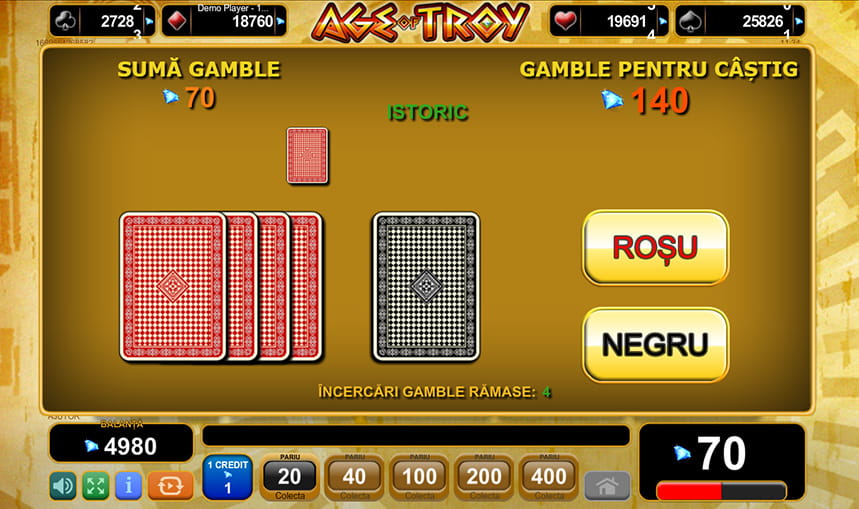 La Age of Troy online slot numărul de linii de plată este selectabil, ceea ce pavează drumul unor strategii de joc. Fiecare jucător poate opta pentru folosirea funcției de pariere, ce poartă numele “Gamble”. În cadrul unui mini-joc, dacă veți ghici culoarea corectă a cărții aflate cu fața în jos, veți putea dubla suma câștigată. Mărimea ecranului de joc poate fi ajustată cu ușurință, iar sunetele pot fi dezactivate.