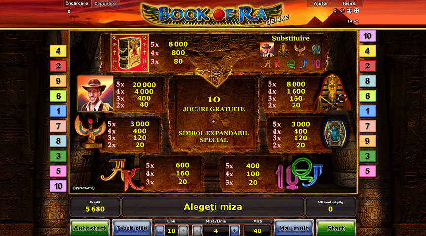 Cazinoul Admiral, alimentat de Novomatic, vă oferă posibilitatea să încercați acest slot, dar puteți face numai câteva runde. Acestea, de cele mai multe ori nu sunt suficiente să puteți observa potențialul de plată al jocului, și ce câștiguri poate genera. De aceea, aici, pe această pagină, aveți oportunitatea să jucați Book of Ra Deluxe gratis fără să efectuați nicio depunere de bani.