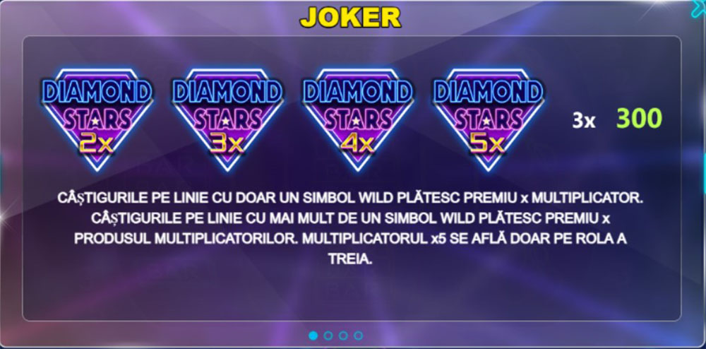 Pe role vei vedea și simbolurile speciale Wild, care vin cu multiplicator de câștig. Acestea înlocuiesc orice alt simbol într-o combinație câștigătoare și aplică multiplicatorul corespunzător. Există și un Wild, numit Diamond Stars 5x Wild, care apare doar pe a treia bobină și oferă un multiplicator 5x.