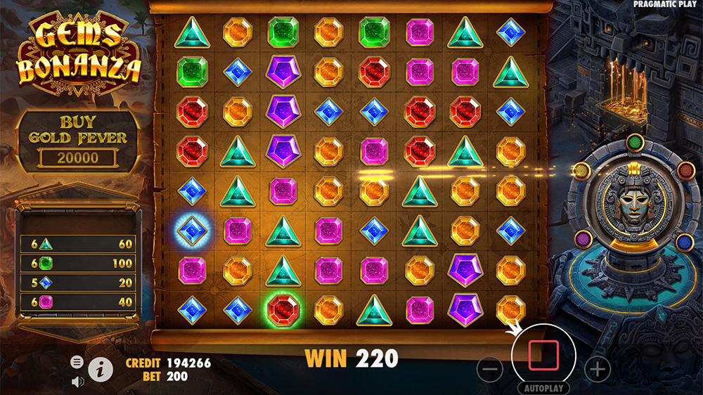 Jocul nu are linii de plată predefinite. Plățile sunt oferite în cluster. Câteva simboluri identice pe role adiacente aduc victorii. De asemenea, Gems Bonanza slot RTP este mare și asociat cu volatilitate mare, caracteristici ce presupun alegerea atentă a pariului. Procentul de revenire este variabil în funcție de caracteristicile activate. Puteți juca cu RTP între 96.55%, 95.54% sau 94.53%.