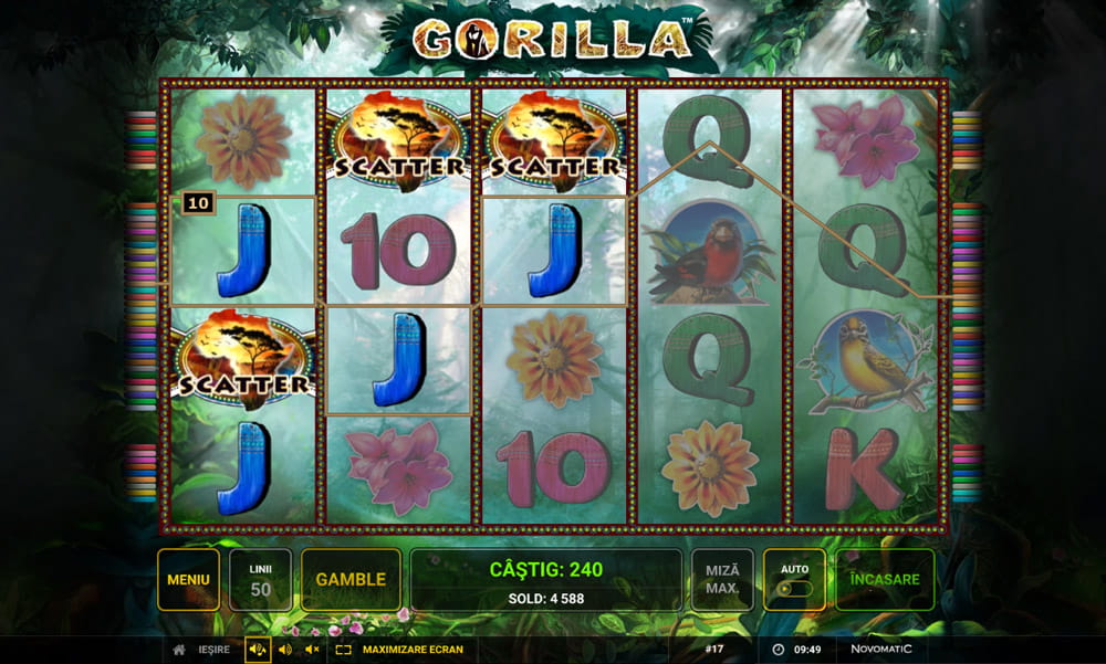 Alimentat de Novomatic, Gorilla păcănele este un joc captivant cu tematică din junglă, cu 5 role și 50 de linii de plată selectabile. Simbolurile de pe role includ gorile, păsări roșii și galbene, flori portocalii și roz, precum și cartile de joc – A, K, Q, J, 10 și 9 decorate cu modelul Africii.